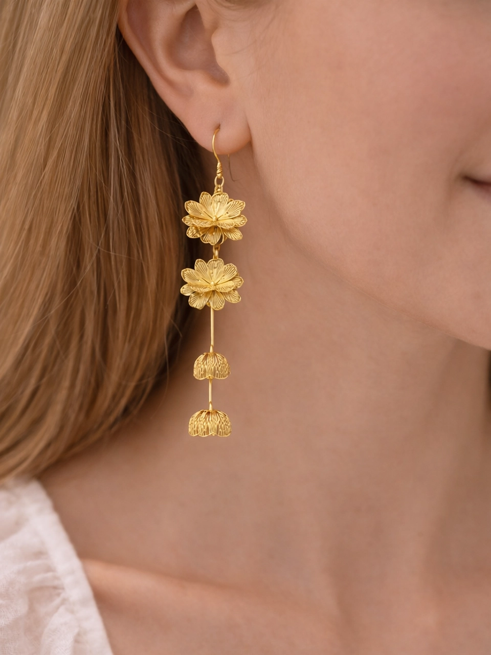 The layered floral elements create dimension at the top. The delicate vertical drops add length and softness. The cascading silhouette gives the design a graceful flow without feeling bulky. That balance makes them perfect for occasions — yet refined enough to style more than once.