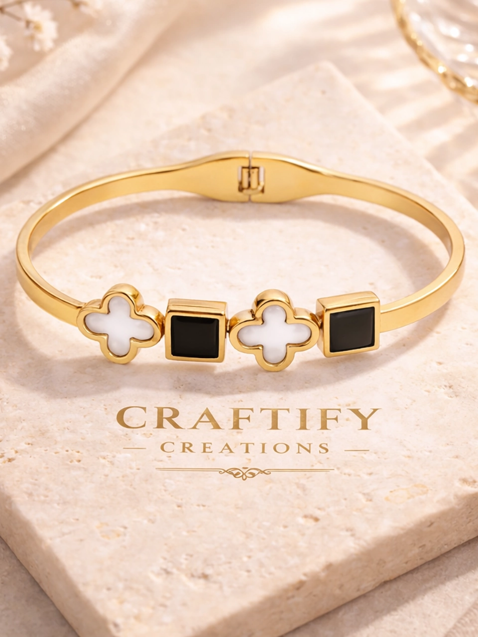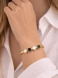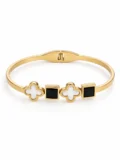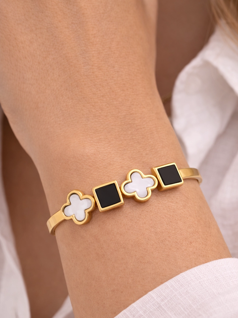 The structured bangle gives it presence. The clover shapes soften the look. The black enamel squares add contrast and depth. That mix makes the bracelet feel bold but still refined. Strong enough to wear alone. Clean enough to stack. The kind of piece that quietly elevates your outfit.