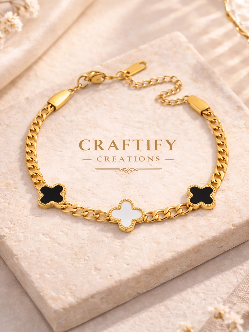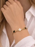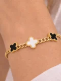 The bold chain gives it presence. The clover charms bring balance and contrast with their black and white details. Together they create a bracelet that feels modern, slightly statement-making, but still easy enough to wear daily. Perfect for stacking. Strong enough to wear solo. The kind of piece that quickly becomes part of your routine.