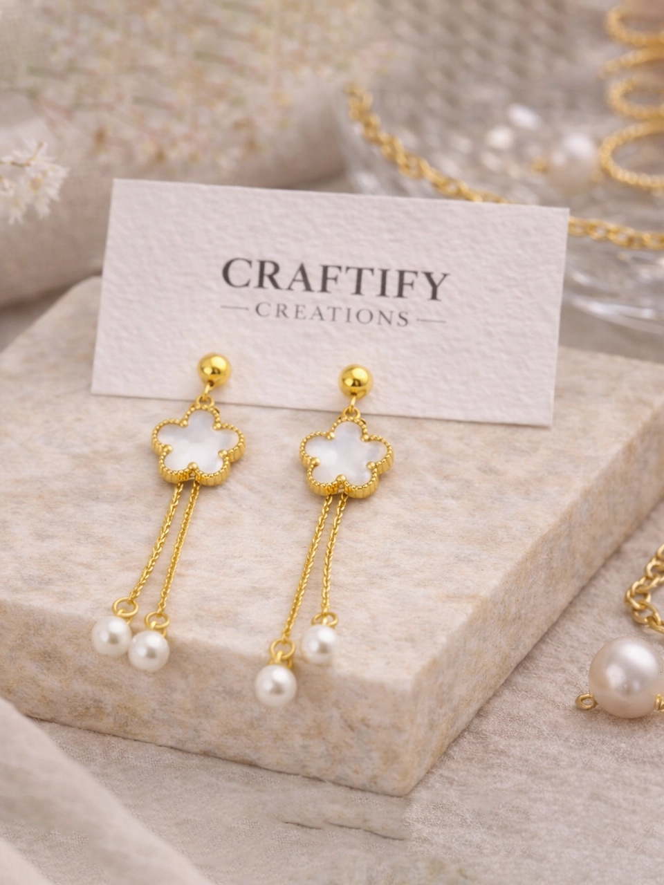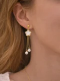 The clover detail adds softness and symmetry. The fine chain drops create movement. The pearl accents bring elegance without making the design feel heavy. That balance makes the pair feel feminine, refined and easy to style. Subtle enough for daytime. Polished enough for evenings.