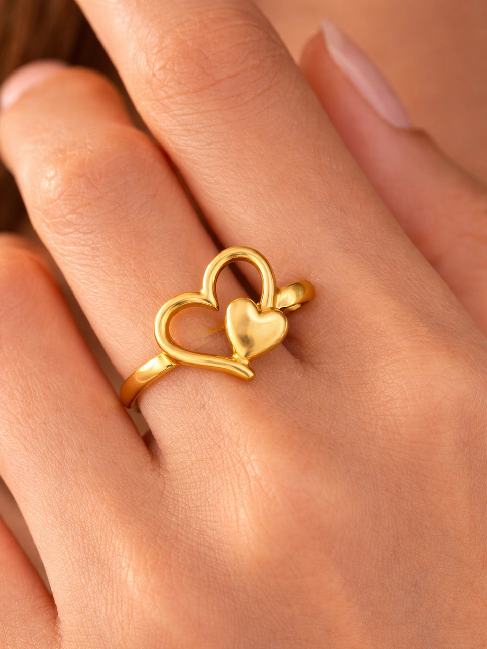 The double heart design keeps it simple but meaningful. One heart is open and sculpted, light and airy. The second heart is polished and solid, adding depth and contrast. Together, they create a soft statement that feels romantic without being overdone. Easy to pair. Easy to gift. Easy to keep on.