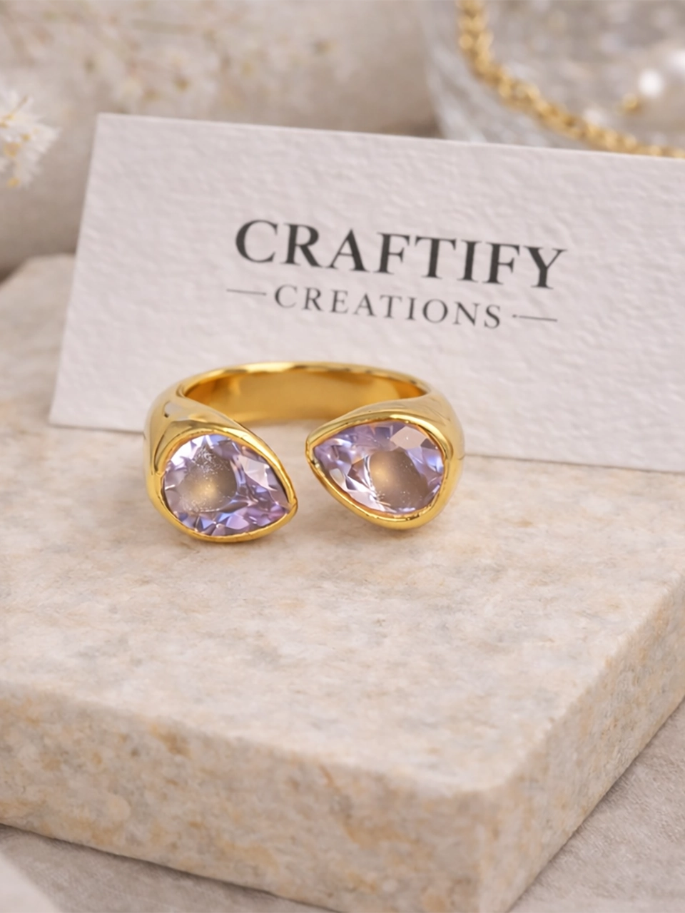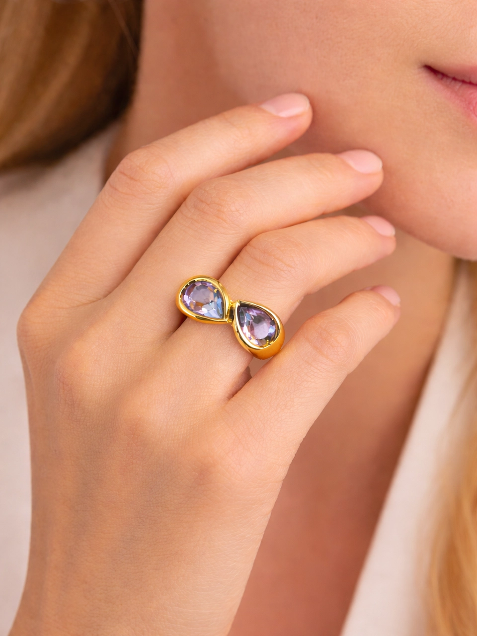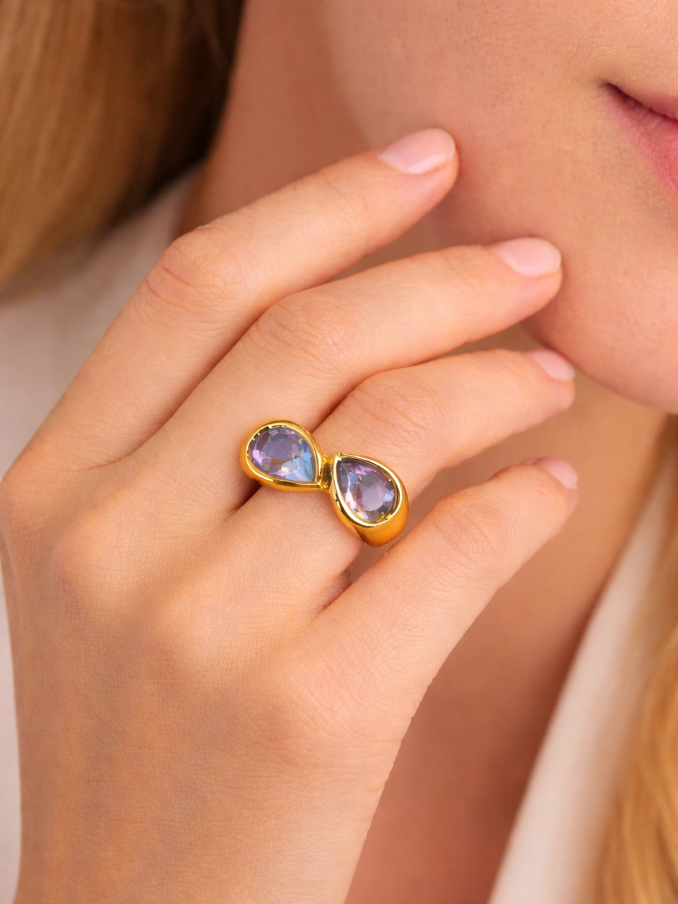 The dual teardrop crystals face each other in a soft open design, catching light from both sides. It feels symmetrical but not stiff. Bold but still wearable. The kind of ring that elevates simple outfits without overwhelming them.