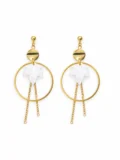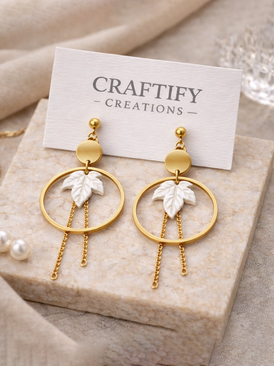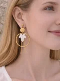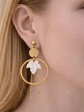 The circular gold hoop creates structure. The white leaf detail softens the look. The fine chain tassels add movement. Together, they create a design that feels bold but balanced. Statement-worthy, yet wearable.