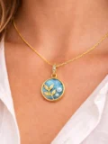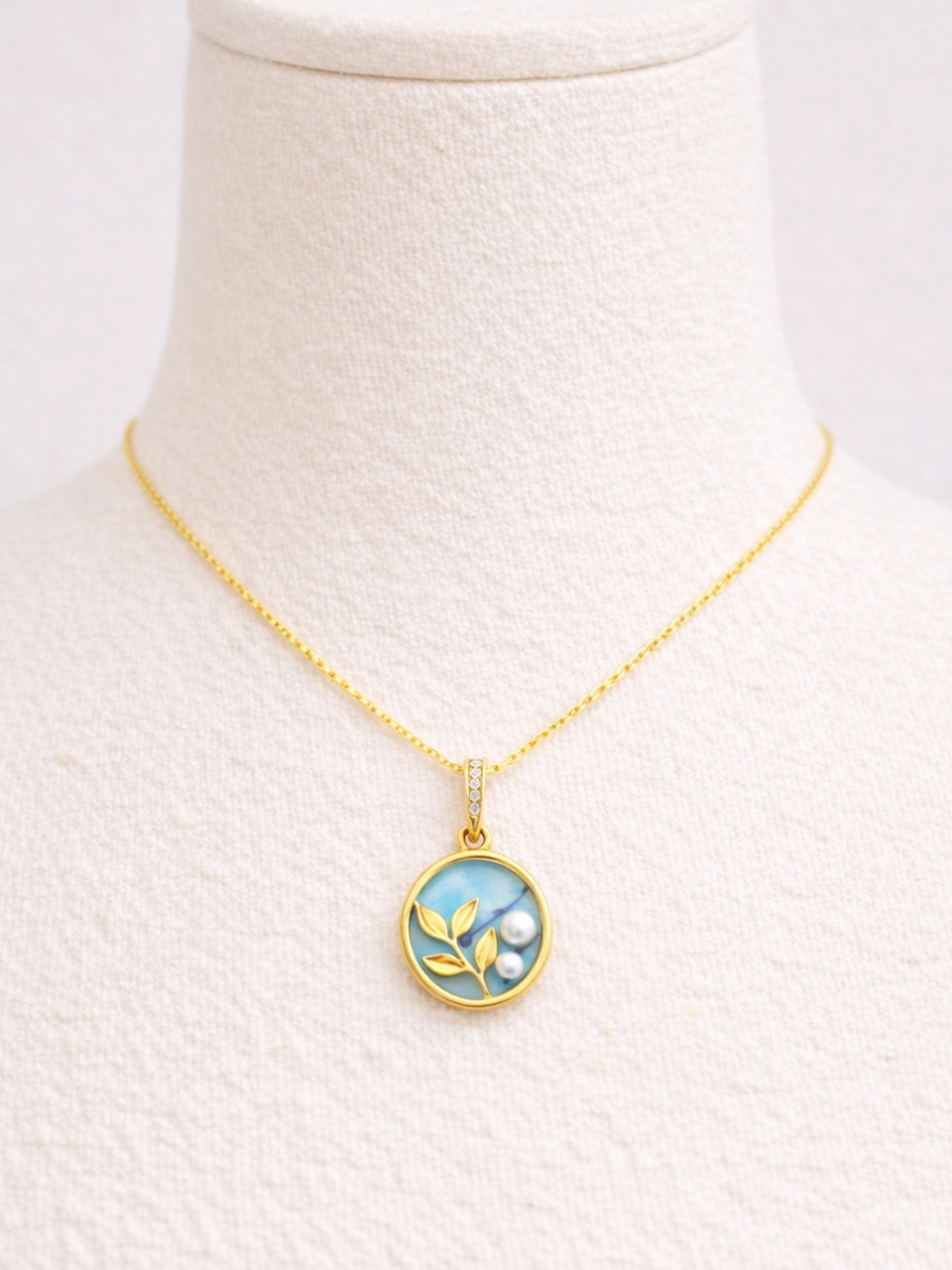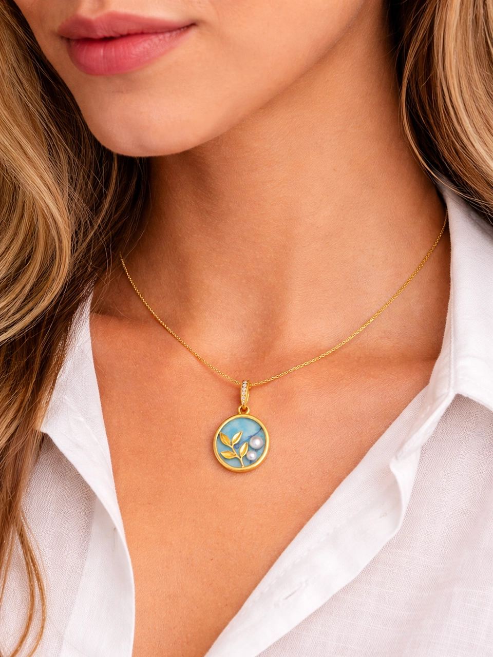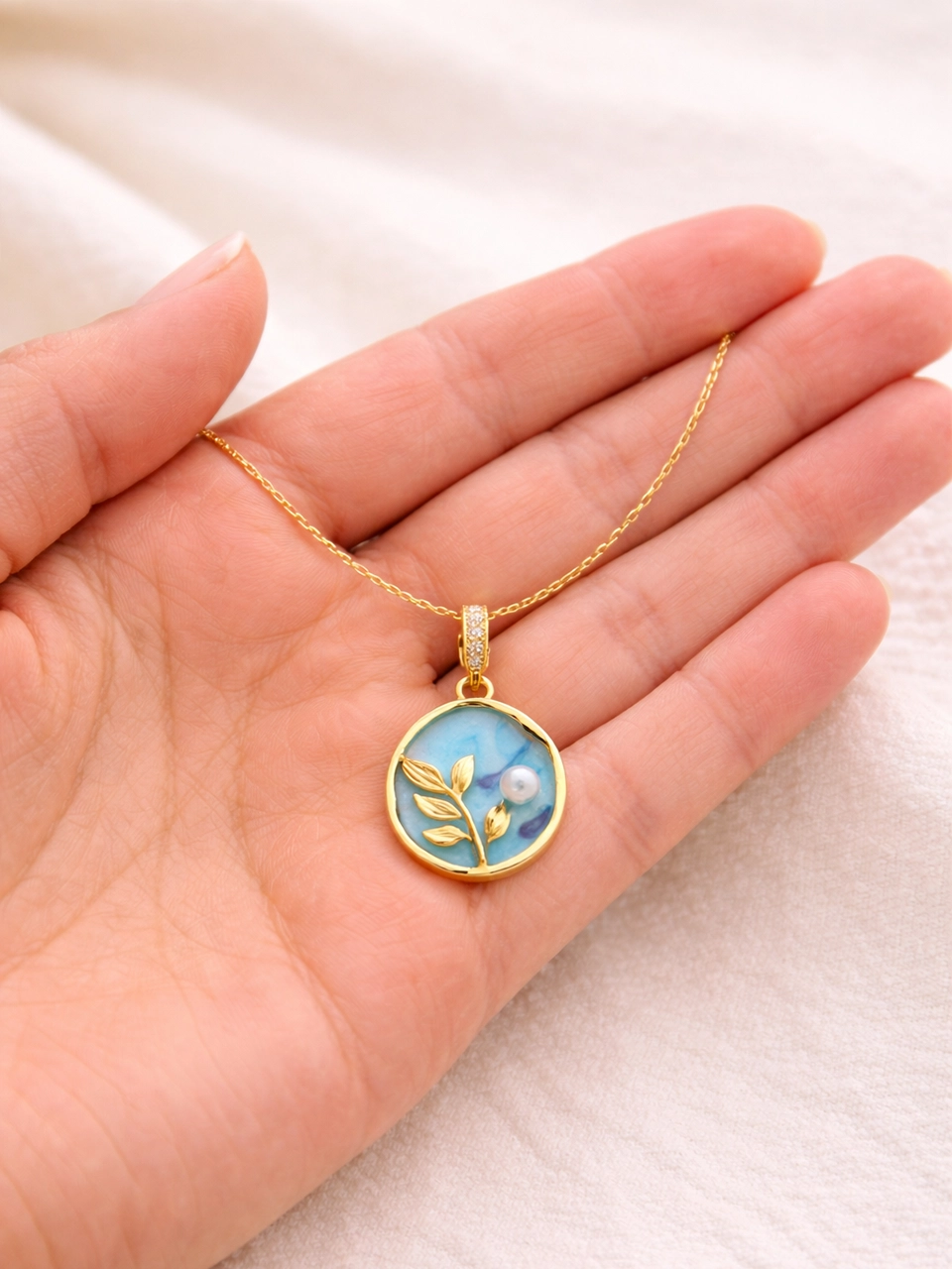 The soft ocean-blue detail, tiny pearl accent and delicate leaf design give it a calm, nature-inspired feel. It feels elegant but still relaxed. The kind of necklace that quietly adds charm to everyday outfits without trying too hard.