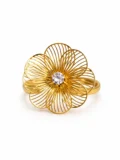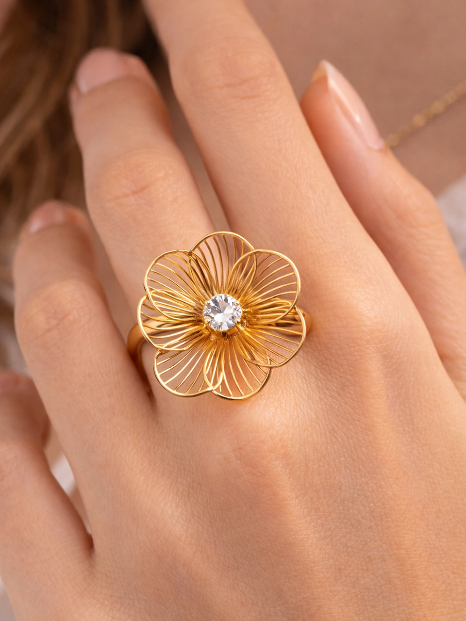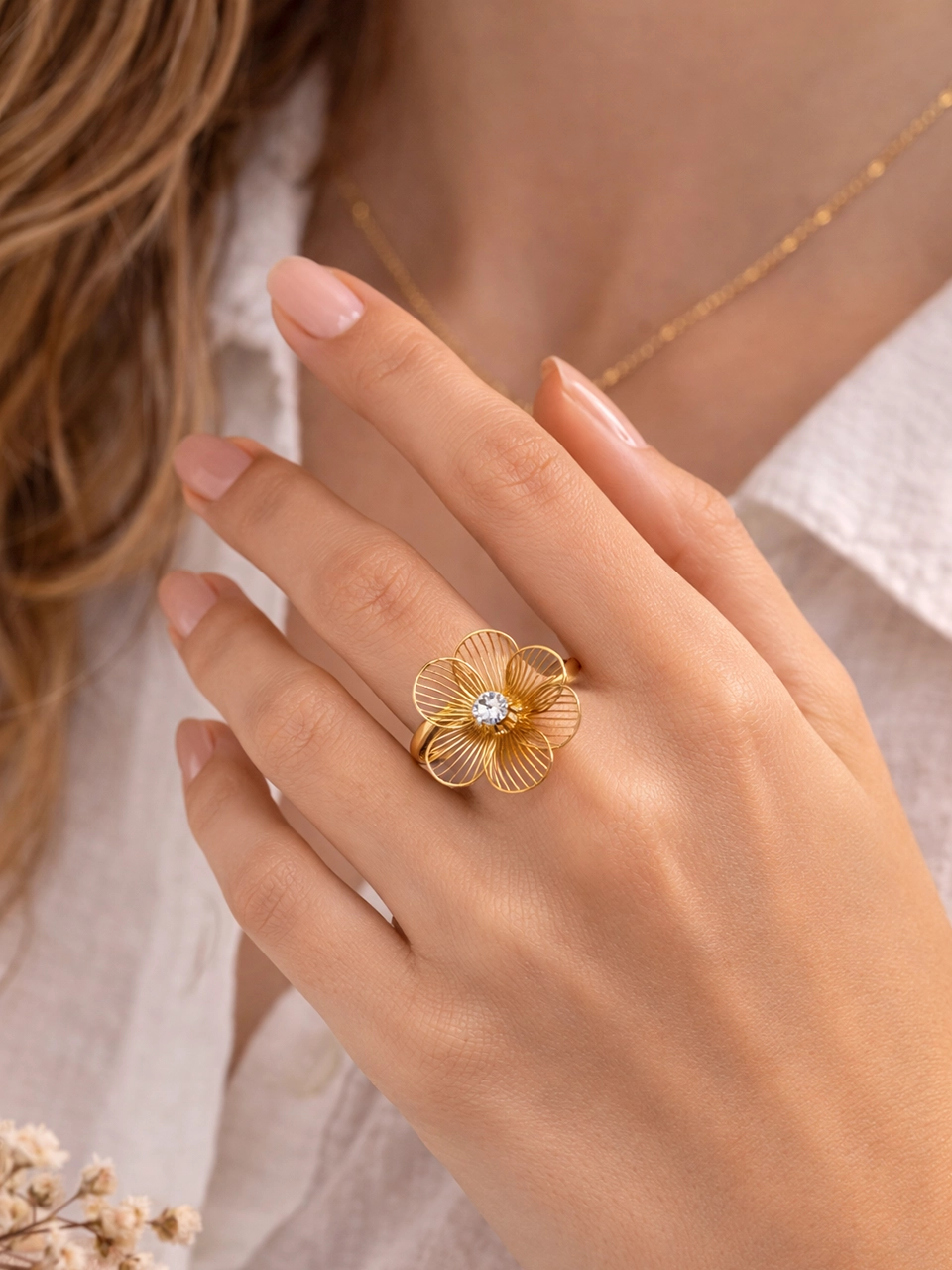 The open petal design gives it depth and lightness at the same time. Each petal has fine cut detailing that catches the light differently as you move. The crystal at the center anchors the entire design, adding just enough shine without making it feel loud. It’s bold. But still elegant.