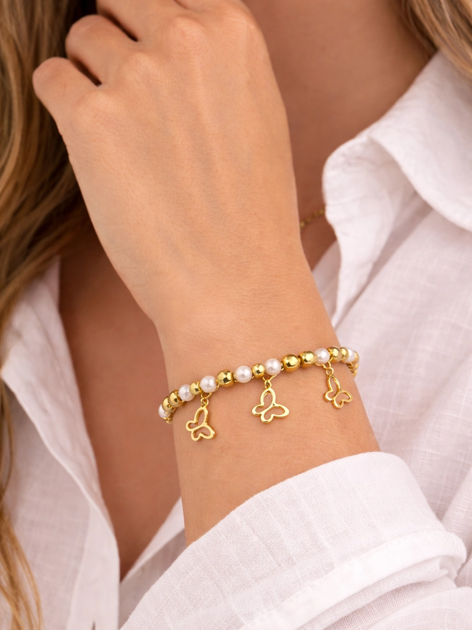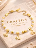 The pearl and gold bead combination keeps it soft and elegant. The butterfly charms add movement and personality. Together they create a bracelet that feels delicate but still modern. Easy to stack. Easy to wear on its own. The kind of piece that quietly becomes part of your routine.