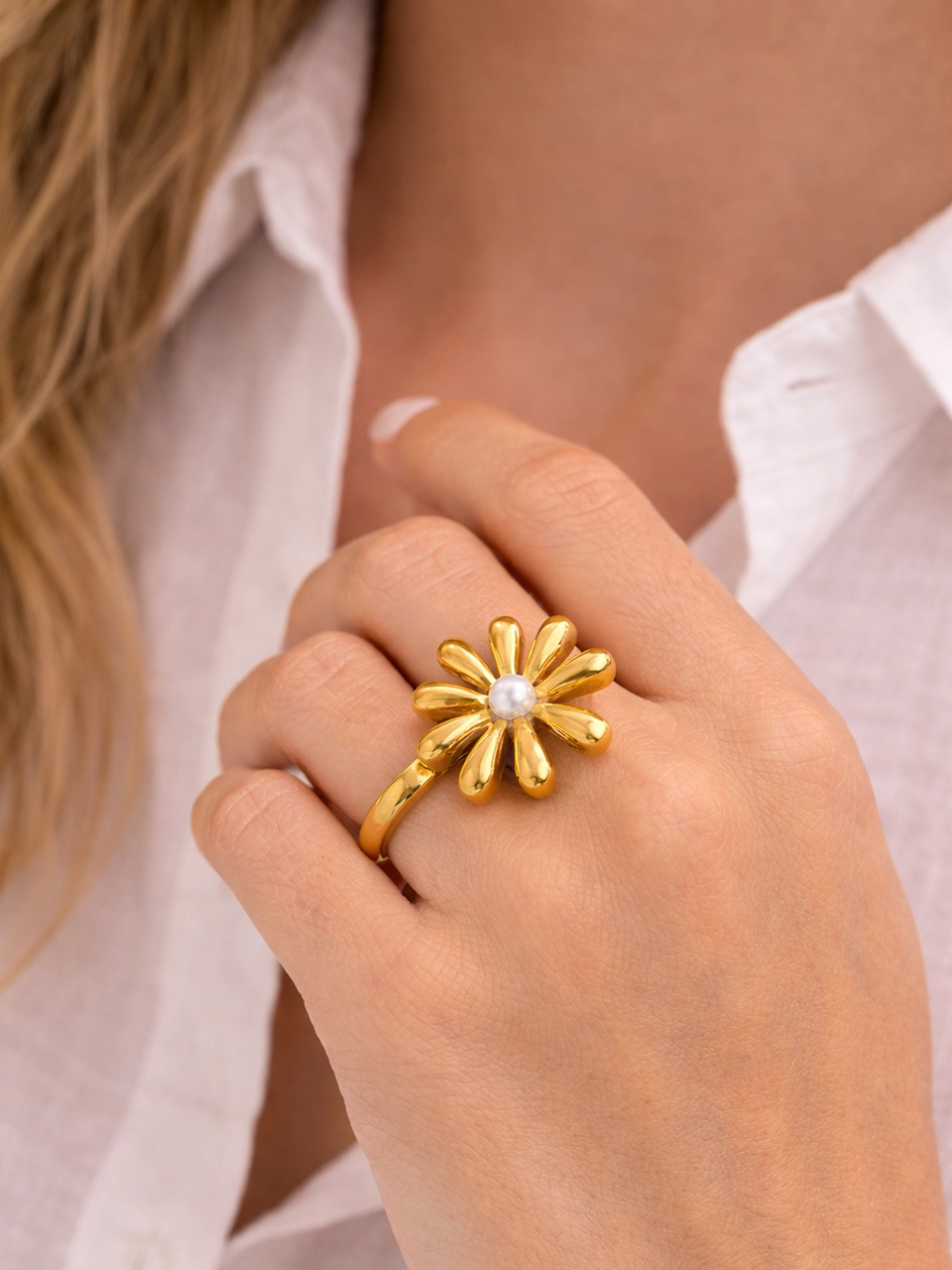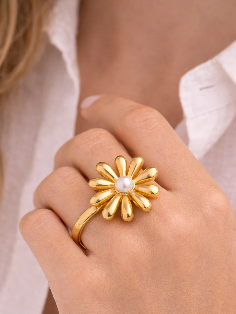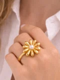 The oversized petal design gives it a sculptural look. Each gold petal curves outward, creating movement and shine from every angle. At the center, a single pearl softens the bold shape and adds balance. It’s a statement piece — but still refined.
