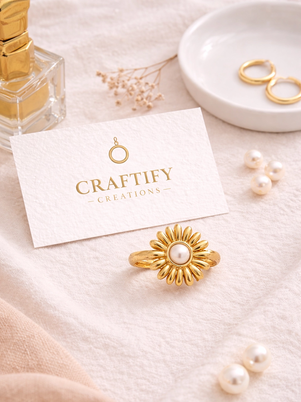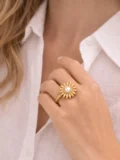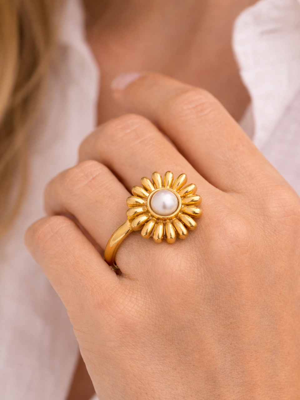 The sunburst design gives it presence. The pearl center softens the bold shape and keeps it elegant. It feels like a statement piece, but not overwhelming. The kind of ring that finishes your look without needing anything else.